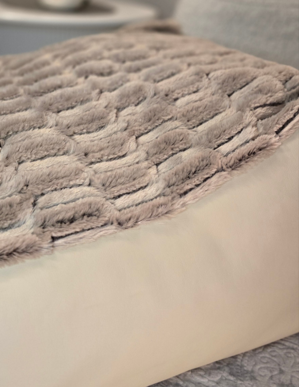 - Luksusowy komfort – górna część leżanki wykonana jest z niezwykle miękkiego, beżowego futerka, które zachęca do odpoczynku i zapewnia maksymalną wygodę. Podwyższona forma pozwala zwierzakowi przyjąć naturalną i relaksującą pozycję.